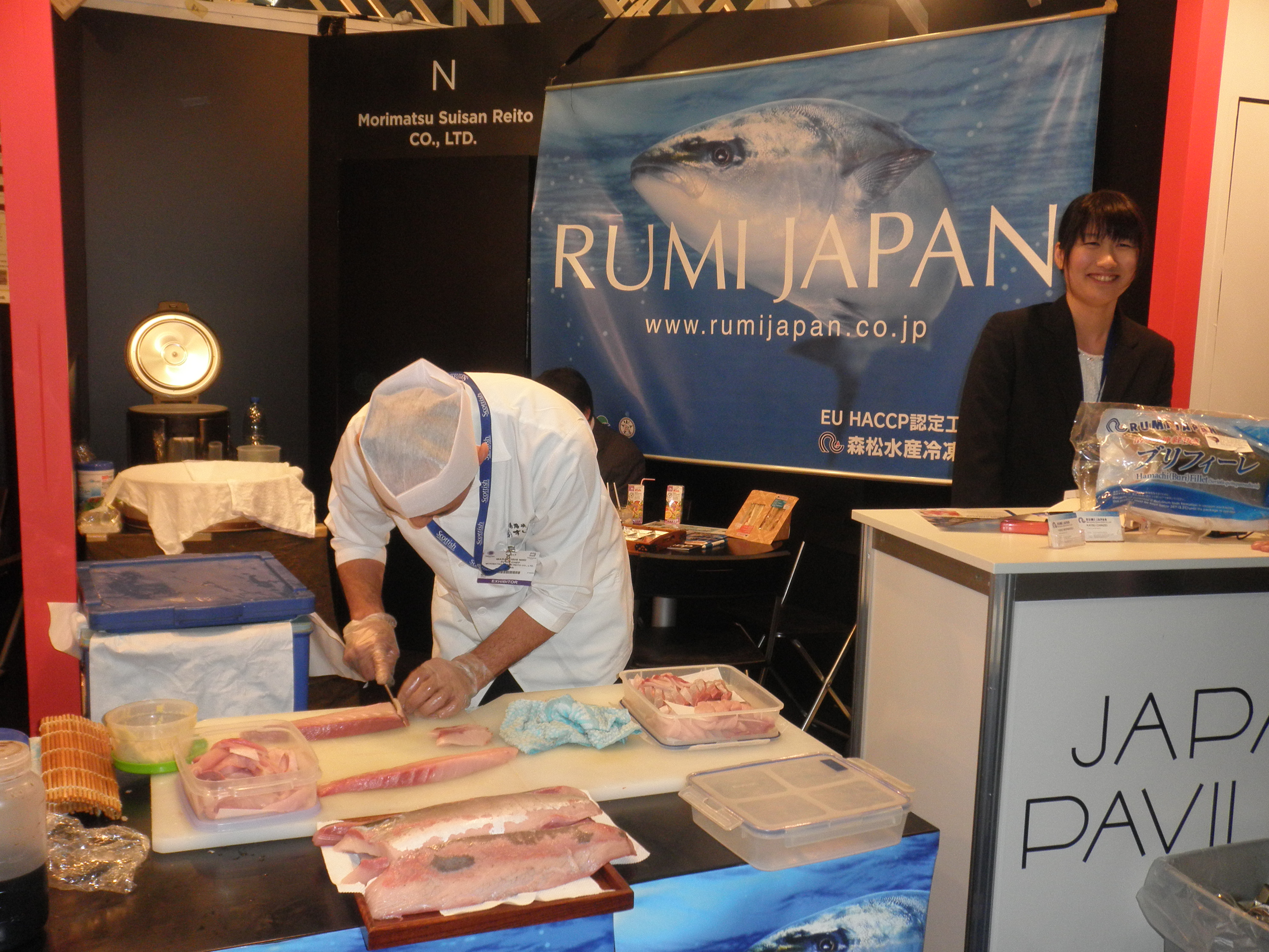 From Tuesday April 21st to Thursday April 23rd 2015, JETRO Brussels hosted a “Japan Pavilion” at the “Seafood Expo Global” that took place at the Brussels Expo exhibition site in Brussels, Belgium, . The Pavilion provided an unique opportunity to experience high quality Japanese seafood products brought by thirteen food and product vendors. Amongst the items displayed: yellowtail (or “Hamachi”), red sea bream (or “Madai”), scallop, Kelp/Sea grass/Konbu, farmed bluefin tuna (or “Hime Maguro”) as well as “sake”, a variety of seasoning products and “wasabi”!
